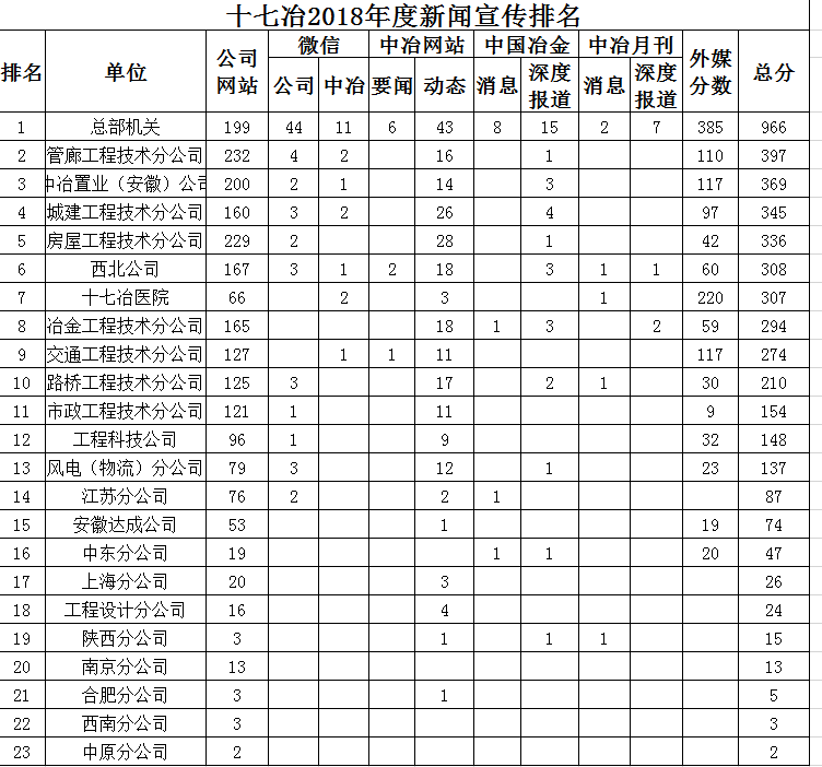 十七冶2018年度新闻宣传排名