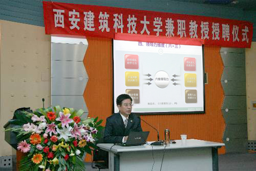 康承业教授在授聘仪式上发表了感言。他说:感谢西安建筑科技大学给了自己一个非常好的平台和机会,这有利于自己寻找在工作实践中的差距,提高自己的理论水平和在管理科学方面的研究能力。他将尽心尽力做好自己的本职工作和兼职教授的工作,为中冶集团和西安建筑科技大学的共同繁荣和发展,以“产、学、研”相结合来进一步增强十七冶前行的动力而不懈努力。
