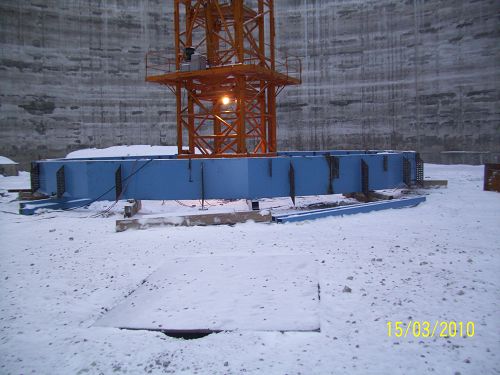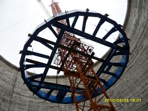 在库壁混凝土施工结束后,总包方原合同约定的俄方施工单位,因施工难度太大,拒绝施工。总包单位紧急求助机电公司俄罗斯项目部,项目部积极组织技术人员,多次查看现场和现有的吊装资源,最后把方案定位为将整个拱顶平台组对为整体进行提升。