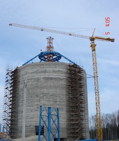 俄罗斯西北水泥公司熟料库总体设计为内直径为40m的桶型圆拱顶结构,其中库壁为混凝土结构,壁高37.8m,库顶为圆锥型钢结构,拱顶由主圈粱和平台粱等组成一层直径为12.5m的圆形钢平台,高度为50m,圆形拱顶平台一圈用20根斜粱撑起,斜梁的另一端固定于库壁顶部,每根斜梁长度17.95m,自重为5.5t。而现场的最大吊车仅为50t吊车,根本不能满足安装,吊装的难度非常大。