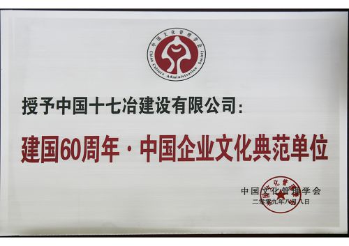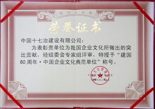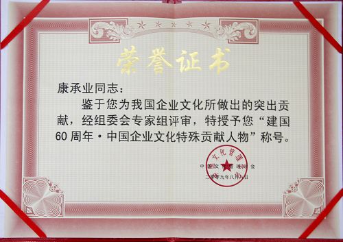 为表彰十七冶对我国企业文化所做出的突出贡献,同时,为表彰康承业同志对我国企业文化所做出的突出贡献,近日,中国文化管理学会特授予十七冶“建国60周年·中国企业文化典范单位”称号;授予十七冶董事长、党委书记康承业“建国60周年·中国企业文化特殊贡献人物” 称号。