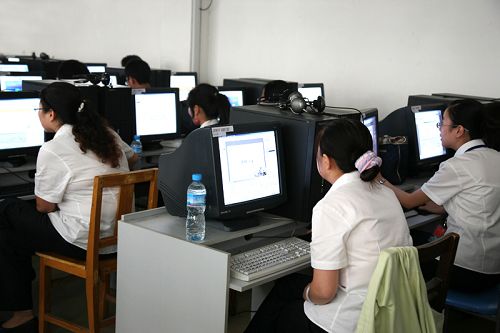 仪式后,参赛选手整队步入比赛机房。紧张有序并全神贯注地开始了为时90分钟的比赛。这次计算机操作技能大赛分为五个部分:一是Windows XP中文操作系统的应用;二是文字编辑的操作:包括文字排版操作、图文混排操作;三是Excel 2003电子表格软件操作;四是PowerPoint2003制作演示文稿软件的操作;五是文字录入比赛。