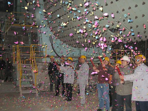 试投产仪式上,在一阵礼炮声中泰州杨湾海螺公司总经理吴维国和项目经理吴德学一起按动电钮,该工程第一台磨徐徐转动起来,标志着整个项目部施工生产的又一重要节点的完成。