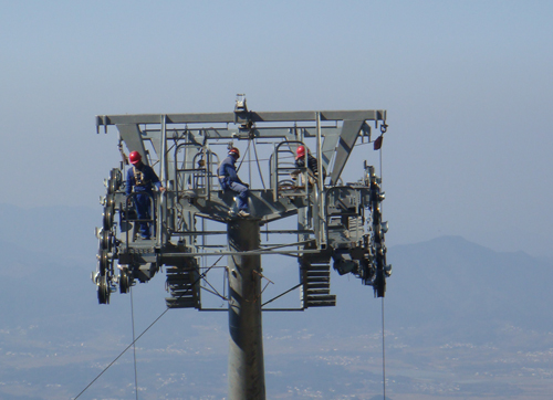 自2009年初进入工地以来,在项目部的组织下,参战的机电公司员工顶风冒雪在悬崖峭壁间树立起施工临时索道塔架。为确保土建工期员工们发扬连续作战的精神,冒着酷暑24小时作业为土建运输材料。特别是从8月下旬设备正式安装开始,为保节点,参战员工发扬“敬业 忠诚 团结 进取”的企业精神,克服重重困难进行设备的运输以及安装工作,通过不懈努力在12月初完成上下站机电设备安装,线路塔架及托压索轮的安装工作,交外方进行编绳和设备调试工作。