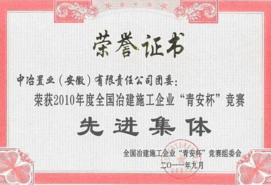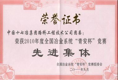 获得表彰的还有:路桥工程技术公司团委获“2010年度全国冶金系统‘青安杯’竞赛先进集体”称号,中冶置业(安徽)公司团委公司获“全国冶建施工企业2010年度‘青安杯’竞赛先进集体”称号,城建工程技术公司李梦龙获“2010年度全国冶金系统‘青安杯’竞赛先进个人”称号。山东分公司李光耀获“全国冶建施工企业2010年度‘青安杯’竞赛先进个人”称号,总部机关李静获“全国冶建施工企业2010年度‘青安杯’竞赛优秀组织者”称号。