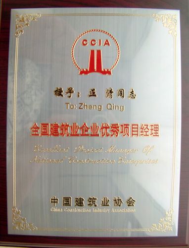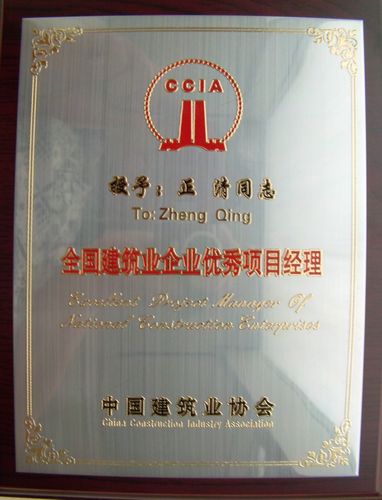 “全国建筑企业优秀项目经理”评选活动由中国建筑企业协会组织实施,是我国建筑行业授予施工企业项目经理的最高荣誉,旨在奖励为中国建筑业做出突出贡献的优秀项目经理。正清同志长期从事工程项目管理工作,其优秀事迹还被中国建筑业协会收录到2010年度《中国建筑骄子——全国建筑业企业优秀项目经理风采录》一书中。