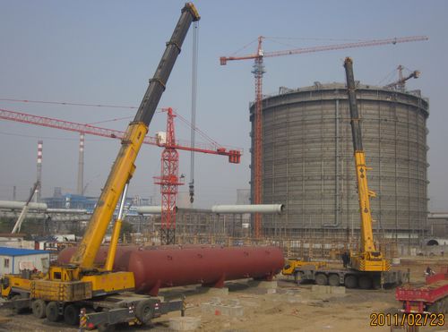 梅钢二期炼钢公辅项目,共有6台蓄热器,1#2#3#蓄热器安装在▽±0.000基础面上,4#蓄热器安装在▽8.500钢平台上,预留5#6#蓄热器。单台蓄热器长约24.2、直径约 3.3、重130吨,是梅钢二期炼钢项目重要大型设备之一。为了确保蓄热器安全吊装到位,项目经理部高度重视。首先组织技术人员、专业工种,对设备现场运输的路线进行了认真勘察,并按技术要求对进场道路、吊装场地进行了铺垫和加固,防止设备在运输过程中倾覆;其二,编制了蓄热器设备吊装安全专项施工方案并通过专家论证,采取了2250吨汽车吊抬吊的施工方法;其三,配备技术过硬、经验丰富的施工人员精心施工,从而确保了2台蓄热器顺利吊装到位。