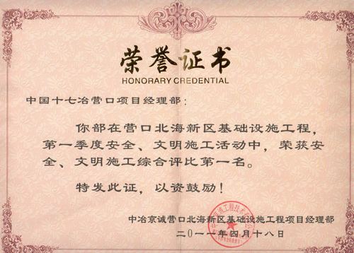 路桥工程技术公司营口北海新区项目部在营口北海新区项目一季度安全、文明施工大检查中,荣获综合评比第一名。