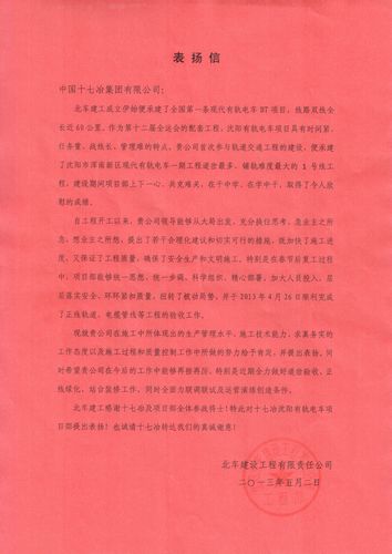 57,北车建设工程有限责任公司向中国十七冶集团发来表扬信,对十七冶路桥工程技术公司沈阳现代有轨电车项目经理部在工程建设中发扬“高效严谨、精细务实”的企业作风,攻坚克难,全力推进工程建设,顺利完成施工任务致以衷心的感谢