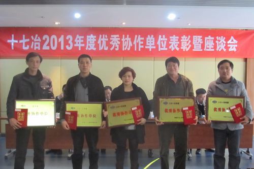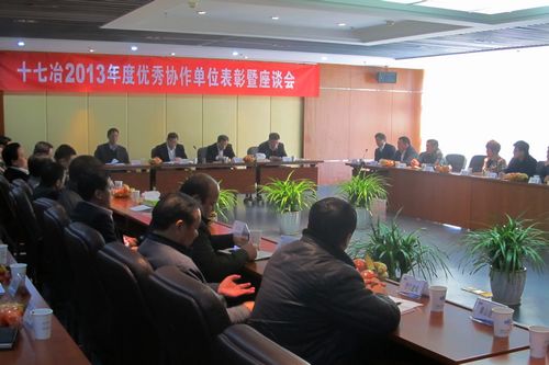 37下午,中国十七冶集团举行2013年度优秀协作单位表彰暨座谈会。大会隆重表彰了21家优秀协作单位和15位星级协作项目负责人。公司副总经理唐灶荣、蔡进,总经理助理王青山、唐克斌,总部机关相关部门、二级公司负责人以及部分优秀协作单位代表、星级协作负责人70余人参加了会议。