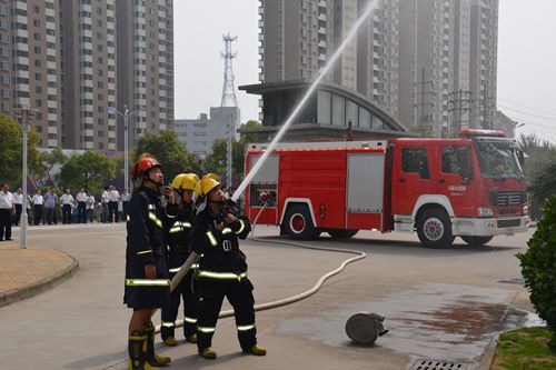 下午15时,公司副总经理唐灶荣宣布“消防演练正式开始”。警报拉响后办公楼内人员迅速做出反应,陆续从大楼中撤出,总时间控制在6分左右。消防车接到报警后快速赶到事故模拟现场,展开救火演练。