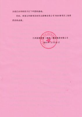 1230,兰州国资投资(控股)建设集团有限公司向中国十七冶集团发来表扬信,对路桥工程技术公司兰州市北环路(二期)西线工程四标段项目部顺利完成各项工程节点任务以及两年来在工程建设中的优异表现表示赞扬和感谢。