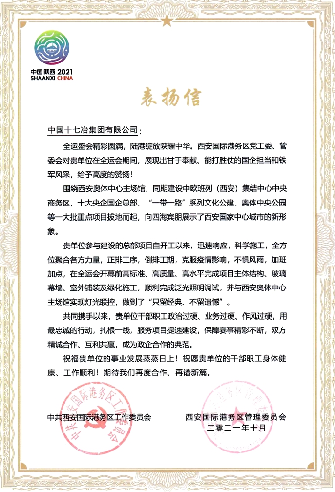 西安国际港务区党工委、管委会向十七冶致表扬信