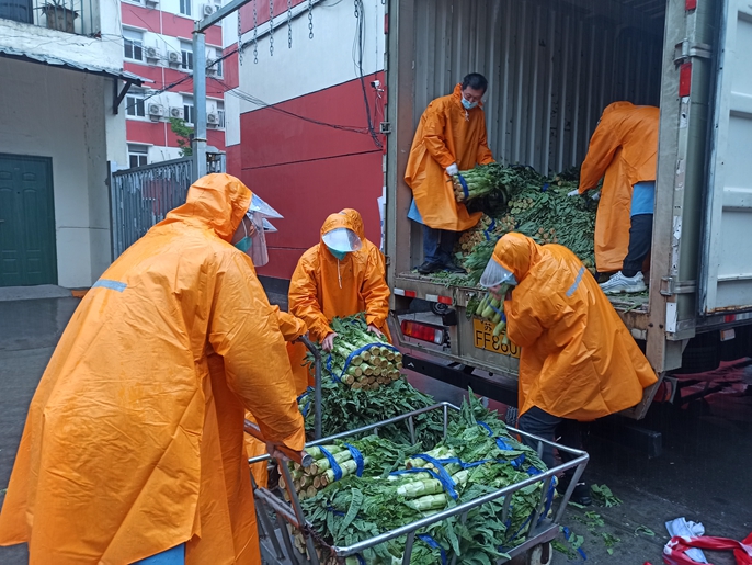 4月14日,工人在搬运接收的中国十七冶援沪蔬菜