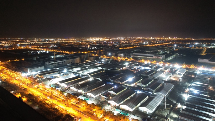 灯火通明的临港竹园方舱建设现场