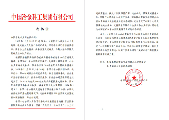 表扬信中指出,根据国务院国资委社会责任局指令和青海省办公厅商请支持函,中国五矿、中冶集团研究决定,先后两次指派中国十七冶负责青海省民和县、循化县灾区300套装配式安置板房援建任务。2023年12月21日上午10时,中国十七冶接到指令后,迅即行动,第一时间派出公司党委委员、副总经理周金龙、安全生产监督管理部魏宁、西北公司王建华、甘肃分公司吴强等同志赶赴灾区,24小时内完成100套装配式安置板房建设任务,同时配备取暖设备和生活物资,确保灾区人民生活需要。2024年1月3日,中国十七冶再次支援海东市循化撒拉族自治县,在周边省份板房严重缺货的情况下,连夜统筹调集200套装配式安置板房和配套物资,并交付使用。