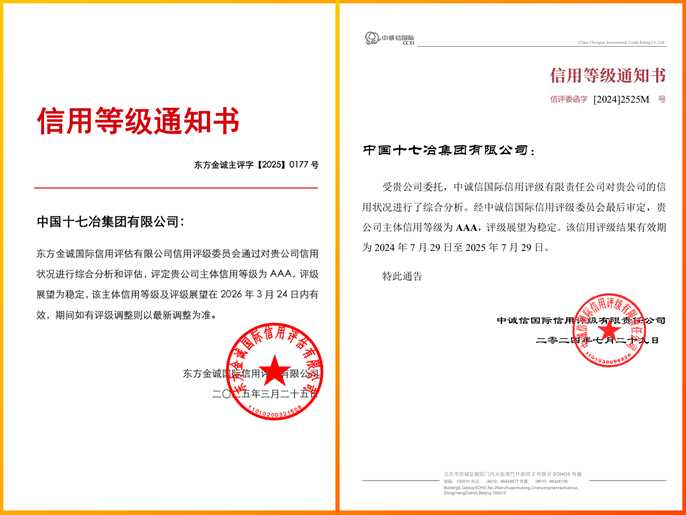 近日,中国十七冶获得东方金诚国际信用评估有限公司主体信用评级AAA级,评级展望为稳定。这是继2024年获得中诚信国际信用AAA评级之后,公司再次斩获国内权威信用评级机构的最高等级认可,正式迈入主体信用双AAA评级新时代,为公司加快打造“全国一流、行业领先的工业化、数字化、绿色化、智能化建筑运营服务商”提供了强有力的发展支撑。