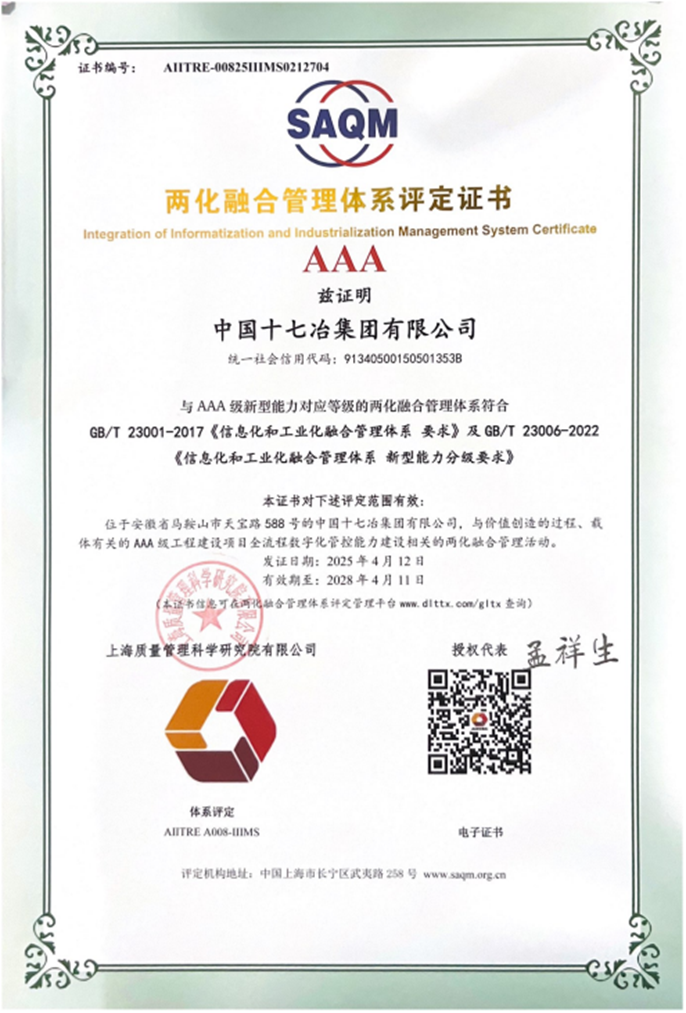 近日,中国十七冶顺利通过国家工信部“两化融合管理体系AAA级”再评定。自2022年首次获得“两化融合管理体系AAA级认定”以来,公司在信息化与工业化深度融合方面持续深耕,此次再评定的顺利通过是对公司在信息化与工业化融合领域卓越实践的再度认可,充分彰显了公司在数字化建设进程中稳步向前的坚定步伐,为公司实现打造“全国一流、行业领先的工业化、数字化、绿色化、智能化建筑运营服务商”目标提供了有力支撑。