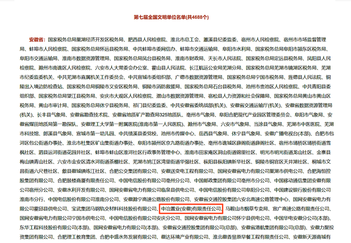 中冶置业(安徽)有限责任公司获得第七届“全国文明单位”称号