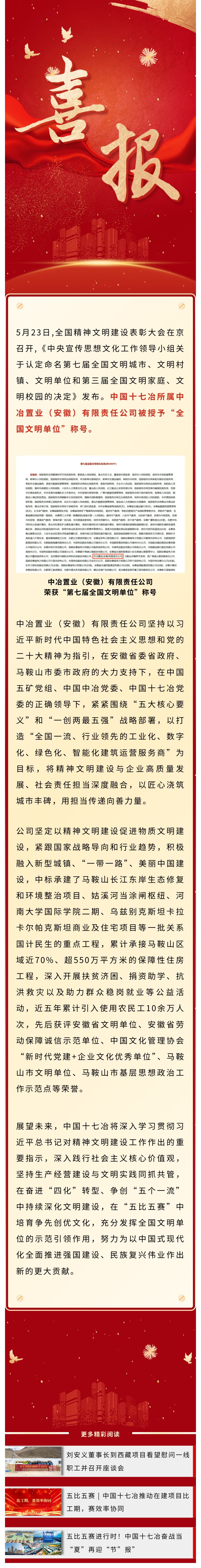 喜报!中冶置业(安徽)有限责任公司荣膺“全国文明单位”