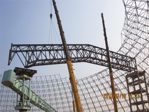 713下午,水泥工程公司济宁海螺工地,两台200吨吊车在阵阵鞭炮声和人们期待的目光中将石灰石堆场罗锅桁架跨越20米高、22长的网架,稳稳地吊运到1号转运站与中心柱顶部的活动平台上。