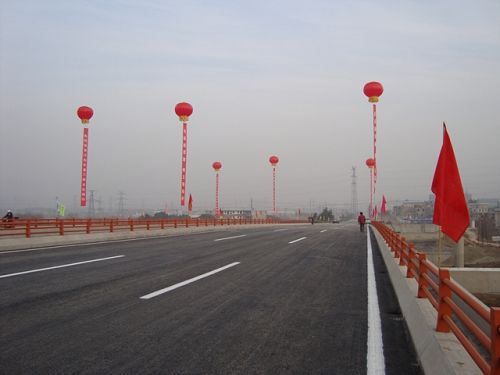 马鞍山市江东大道三期阳湖塘大桥工程,主桥分为上、下行两座独立的桥梁结构,桥梁总长198m,单幅桥宽14m采用预应力混凝土连续现浇箱梁结构,跨径布置为24+5*30+24m,双向六车道,供机动车辆行驶。