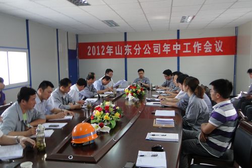 716下午,山东分公司召开2012年年中工作会议,分公司全体管理人员,项目部主管级以上管理人员参加了会议。会上分公司副经理蒋永辉带领与会人员,认真学习王建国董事长在公司年中工作会议上的重要讲话和喻世功总经理所做的工作报告。各项目部负责人汇报了上半年的工作总结。分公司总工程师潘邦全对2012年上半年分公司科技创新、质量安全工作作了总结。
