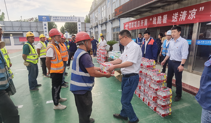 党员突击队授旗仪式后,项目部开展了“战酷暑、送清凉”慰问活动,为参建的一线工友送上了矿泉水,藿香正气水,仁丹等防暑降温用品。