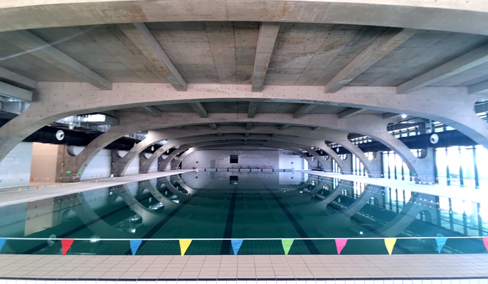 由中国十七冶集团承建的景德镇艺术职业大学A区项目总建筑面积约275460平方米,建设内容主要包括教学楼、宿舍楼、体育馆、产业孵化楼、图书馆、美术馆、行政中心、演艺中心、艺术酒店等16个单体。该项目游泳馆位于体育馆地面层,游泳馆设置8道50米长的标准泳道泳池一座、2个大戏水池、1个小戏水池,泳道深度从1.8米至2米,大戏水池0.9米深、小戏水池0.6米深。泳池循环水处理分为物理净化过程和化学药剂消毒除菌两部分,物理净化过程采用逆流式循环,全部水量由池底送入泳池内,再由池岸两侧溢流回水,具备布水均匀、水面悬浮物和油膜能及时排除且不易沉积污物等优点,更加清洁干净卫生。