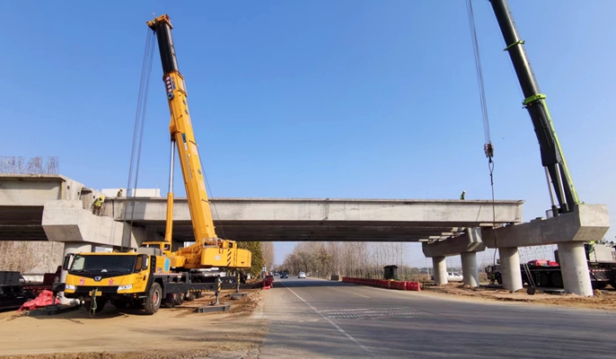 此次施工的S326分离立交位于主K46+860-K46+972,全长112米,宽11.75米,上部结构采用24片35米简支小箱梁,桥下净空高6米。为确保箱梁顺利架设,项目部从架设顺序、人员设备、运输路线、应急预案、安全防护、技术交底等全流程进行详细安排,联系对接交警大队,编制专项导流方案,安排专人指挥疏通,为架设施工奠定了坚实的安全基础。
