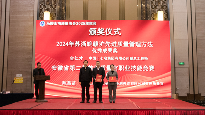 近日,江苏、浙江、安徽、江西、上海“四省一市”市场监管局联合发布2024年“苏浙皖赣沪先进质量管理办法”奖,中国十七冶申报的质量管理方法《“多维度立体式”质量管控模式》继2024年入选“苏浙皖赣沪先进质量管理方法”优秀案例后,首次荣获该奖项。1月15日,在马鞍山市质量协会2025年年会上,马鞍山市副市长左年文为公司颁发了荣誉证书,公司副总工程师、技术质量管理部部长金仁才参加会议。