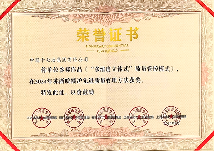 此次获评“苏浙皖赣沪先进质量管理办法”奖,是十七冶深入学习贯彻习近平总书记关于质量工作的重要论述,全面落实《质量强国建设纲要》精神,狠抓质量提升、推动质量变革,力促质量品牌协调发展的又一标志性成果。公司将以此为契机,按照中国五矿、中国中冶工作部署,坚定不移推进质量强企建设,助力质量强企建设再上新台阶,让十七冶品牌在全国、全行业叫的更响。(城建分公司 龙艳菊、南勃)