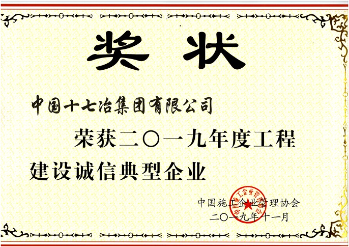 129日,中国十七冶集团收到中国施工企业管理协会颁发的荣誉证书,公司“工程建设AAA信用等级”复审通过,并被授予“2019年度工程建设诚信典型企业”荣誉称号。