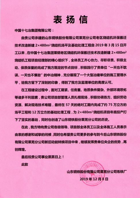 表扬信充分肯定了中国十七冶集团作为大型冶建单位的施工管理水平,对十七冶项目部成员面对工期紧、任务重、地质条件复杂等不利因素时,扎根现场,解决难题,在57天的绝对工期内完成了约75万立方米的场平工程和12万立方米的基础处理工程,为新建2×480平方米烧结机项目年底投产打下了坚实的基础,创造了山钢股份莱芜分公司的基建速度新记录。