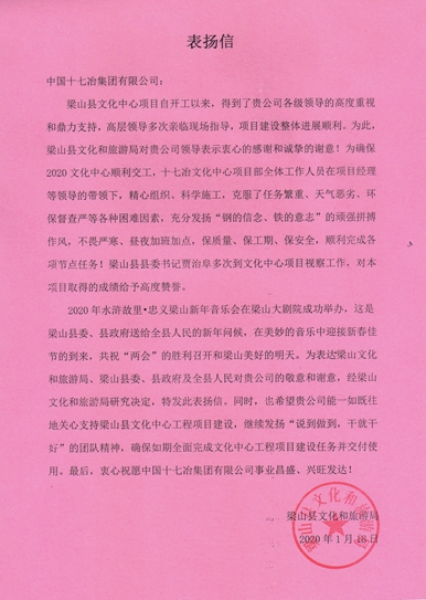 1月18日,梁山县文化和旅游局向中国十七冶集团发来表扬信,对十七冶山东分公司顺利完成梁山县文化中心工程各施工节点,及公司领导对该项目的高度重视、项目部全体人员的辛勤付出表示感谢。