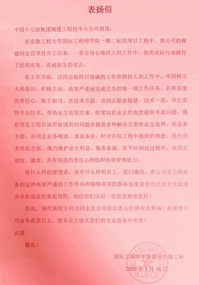 326日,中国十七冶集团城建工程技术分公司收到安徽工程大学国际工程师学院建设办施工科发来的表扬信,表扬项目部程建同志工作积极主动,敢于担当,高效严谨推进工程建设,赢得了各方认可。