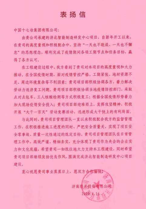 420日,中国十七冶集团收到济南经开投资有限公司发来的表扬信,表扬山东分公司济北智能制造研发中心项目部高度重视、积极配合,顺利完成了疫情期间各项工期节点和任务目标,赢得了各方认可。