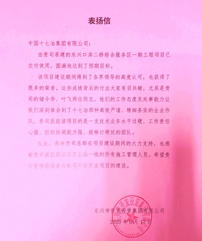 6月28日,东兴市投资集团有限公司向中国十七冶集团致表扬信,对中国十七冶集团在承建东兴国门项目进程中“高效严谨、精细务实”的企业作风给予高度赞扬。