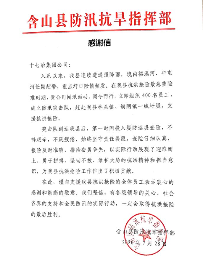 7月28日,中国十七冶集团收到安徽含山县防汛抗旱指挥部发来的感谢信,对公司支援含山县抗洪抢险的全体员工表示衷心的感谢和崇高的敬意。