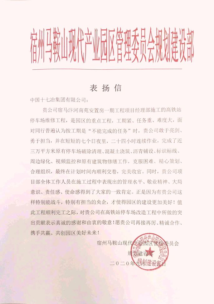 9月25日,宿马现代产业园区管委会向中国十七冶集团致表扬信,高度评价房屋分公司宿马汴河南苑安置房一期项目部在高铁站停车场改造工程中精心策划,敢于担当,高效严谨推进工程建设。