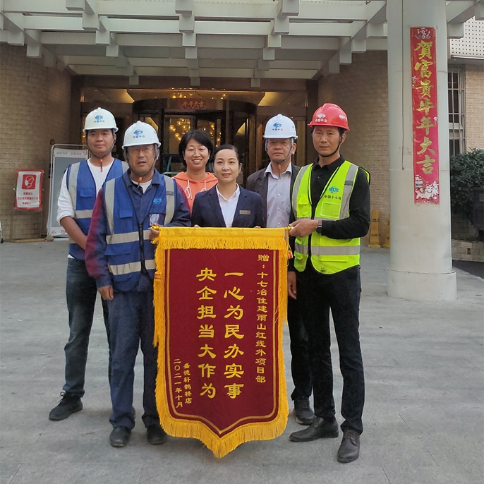 10月18日一早,马鞍山市盛德轩酒店负责人将一面印有“一心为民办实事,央企担当大作为”的锦旗送到了十七冶雨山片区项目部,表达了对十七冶项目团队为民办实事的诚挚谢意。