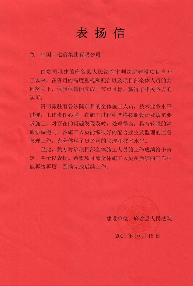 府谷县人民法院向十七冶致锦旗和表扬信