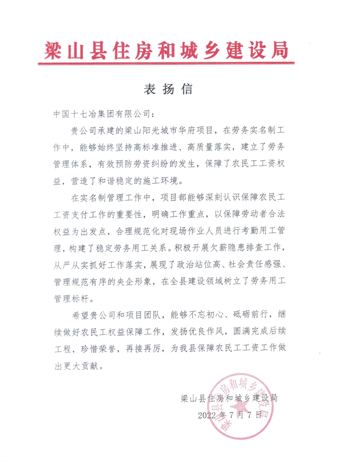 7月7日,山东梁山县住房和城乡建设局向中国十七冶集团致表扬信,对山东梁山县阳光城市华府项目在劳务实名制管理工作所作出的努力和贡献表示感谢。