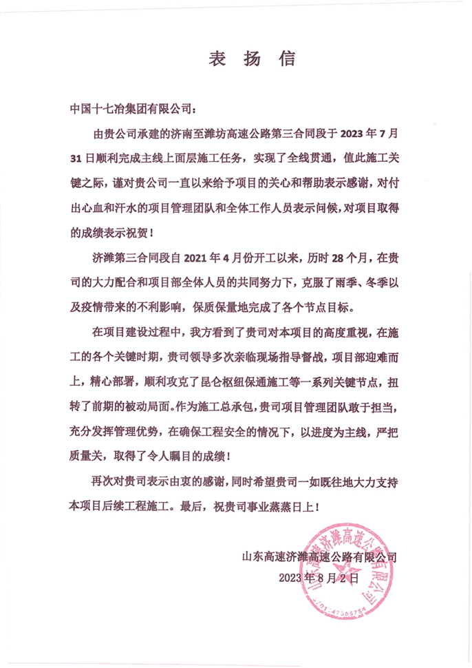 8月2日,山东高速济潍高速有限公司向中国十七冶集团致表扬信,对交通分公司济潍高速三标项目团队攻坚克难、勇毅前行,于7月31日优质高效实现全线贯通这一关键节点表示感谢。