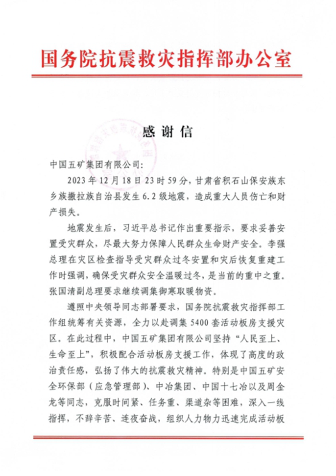 感谢信特别指出,中国五矿集团有限公司坚持“人民至上、生命至上”,积极配合活动板房支援工作,体现了高度的政治责任感,弘扬了伟大的抗震救灾精神。特别是中国五矿安全环保部(应急管理部)、中冶集团、中国十七冶以及周金龙等同志,克服时间紧、任务重、渠道杂等困难,深入一线指挥,不辞辛苦、连夜奋战,组织人力物力迅速完成活动板房拆卸、装车,运输及安装工作,亲自派员押运,确保在规定的时间内将板房运抵并安装完成。