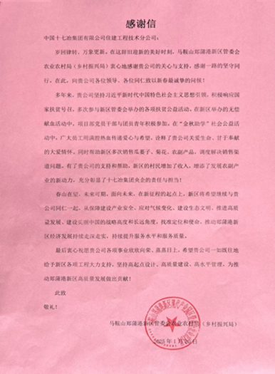 1月20日,马鞍山郑蒲港新区管委会农业农村局(乡村振兴局)向中国十七冶集团致感谢信,对十七冶长期以来支持郑蒲港新区民生工作表达衷心感谢。