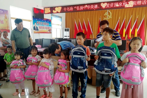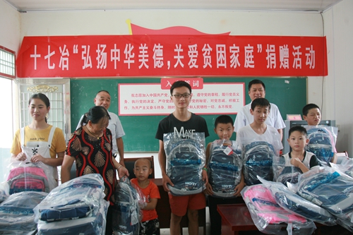 8月31和9月2日,在新学期来临之际,中国十七冶集团在和县功桥镇长建村、定远县蒋集镇秦集村两个定点扶贫村开展以“弘扬中华美德,关爱贫困家庭”为主题的捐赠活动。共捐出百套书包、文具和12台电脑,使百名贫困学子新学期背上了新书包。