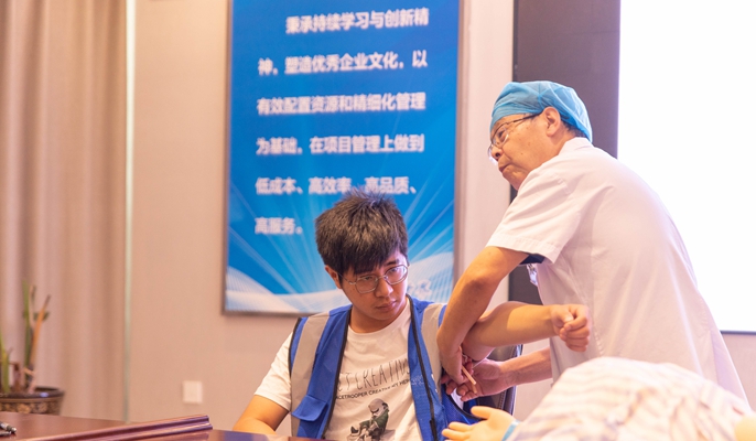 8月14日下午,中国十七冶集团上海分公司嘉定片区项目党支部邀请当地医院外科主任马向富来到嘉定菊园项目部,为施工管理人员及班组长进行了一次紧急救护、健康知识普及讲座。