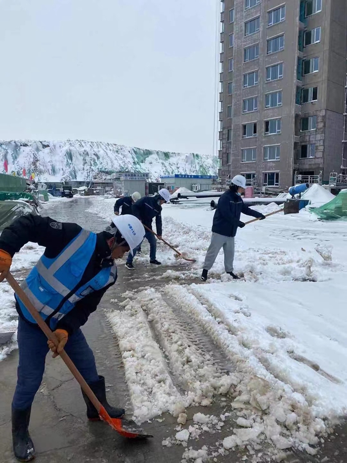 项目全体管理人员在支部党员带领下,采取铁锹开路、扫帚清扫、铲车推雪、融雪盐满撒的方式对现场主路、楼座支路、办公区和生活区全范围进行路面积雪清理。大家不怕冷、不喊累,经过一天的清理,项目现场主支路、办公区和生活区全范围内的积雪已全部清理到位。同时为应对极端寒潮天气对广大一线作业人员的工作和生活的不利影响,项目党支部积极排查生活区空调运行情况,针对运行不畅的空调全部修理到位,工人宿舍的洗漱间、淋浴间配备热风机,施工区配备两台循环热水炉,为工友生活生产提供保障。