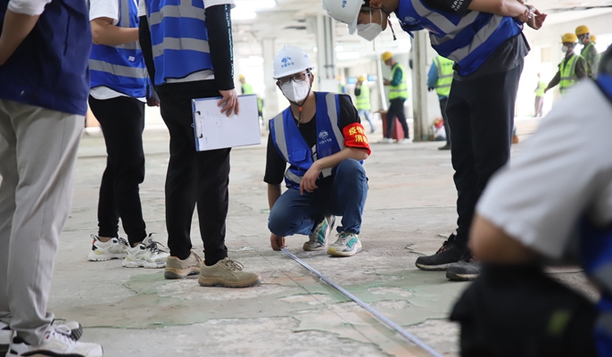 13日,300名作业人员完成剩余PVC地板铺设和全部隔断安装。